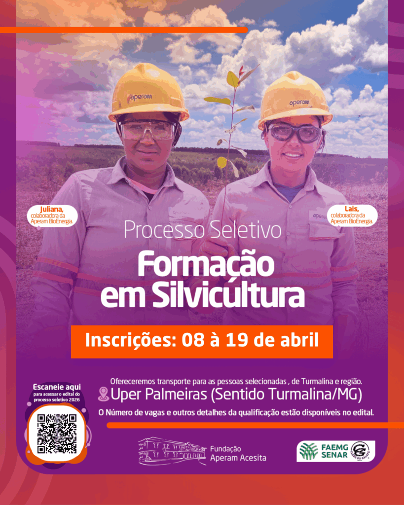 A Aperam BioEnergia, em parceria com a Fundação Aperam Acesita, está com inscrições abertas para o curso de Formação em Silvicultura. Para participar, é preciso ter 18 anos completos, ensino fundamental e morar em Turmalina ou região. As inscrições devem ser feitas